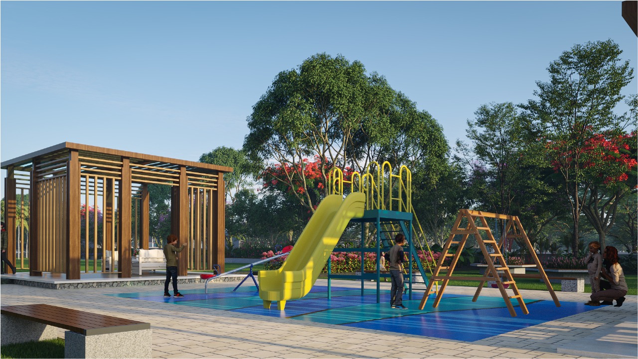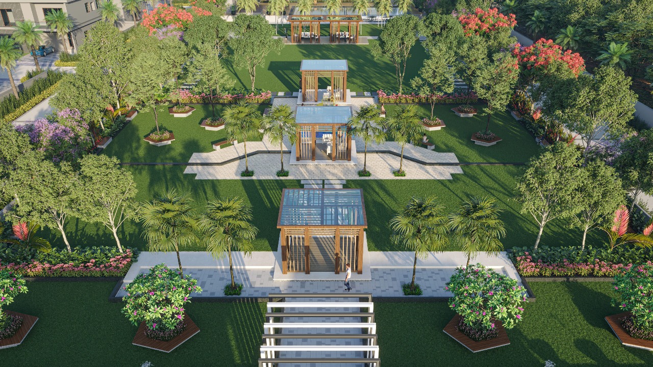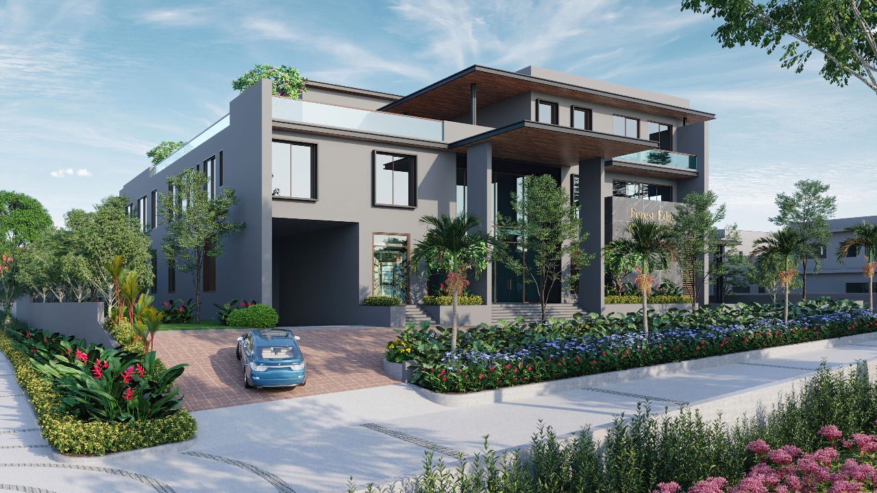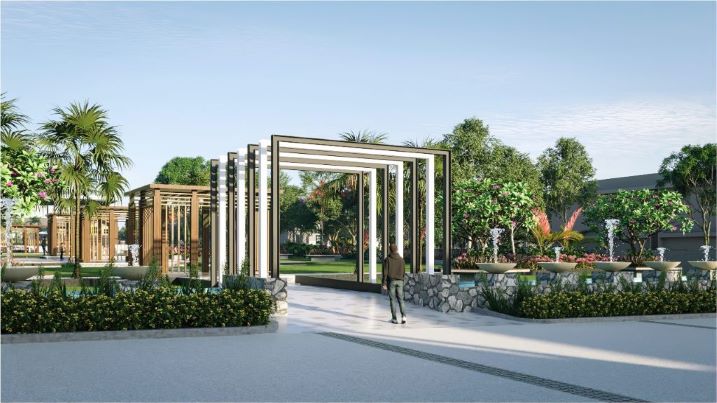 The landscaped forecourt, with its layered planting, colorful seasonal blooms, and tree-lined edges, not only enhances the visual appeal but also establishes a calm, refreshing atmosphere right at the entry. With its contemporary design, wooden canopy, and sleek finishes, the gateway creates a striking first impression for residents and visitors alike. The landscapes by Jagadeesh Landforms add character to the entrance, featuring colorful flowering plants, layered greenery, and tree-lined edges that soften the bold architectural lines.